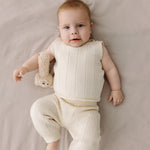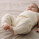 Baby in a cream outfit holding a plush toy on a braided Merino wool baby blanket.