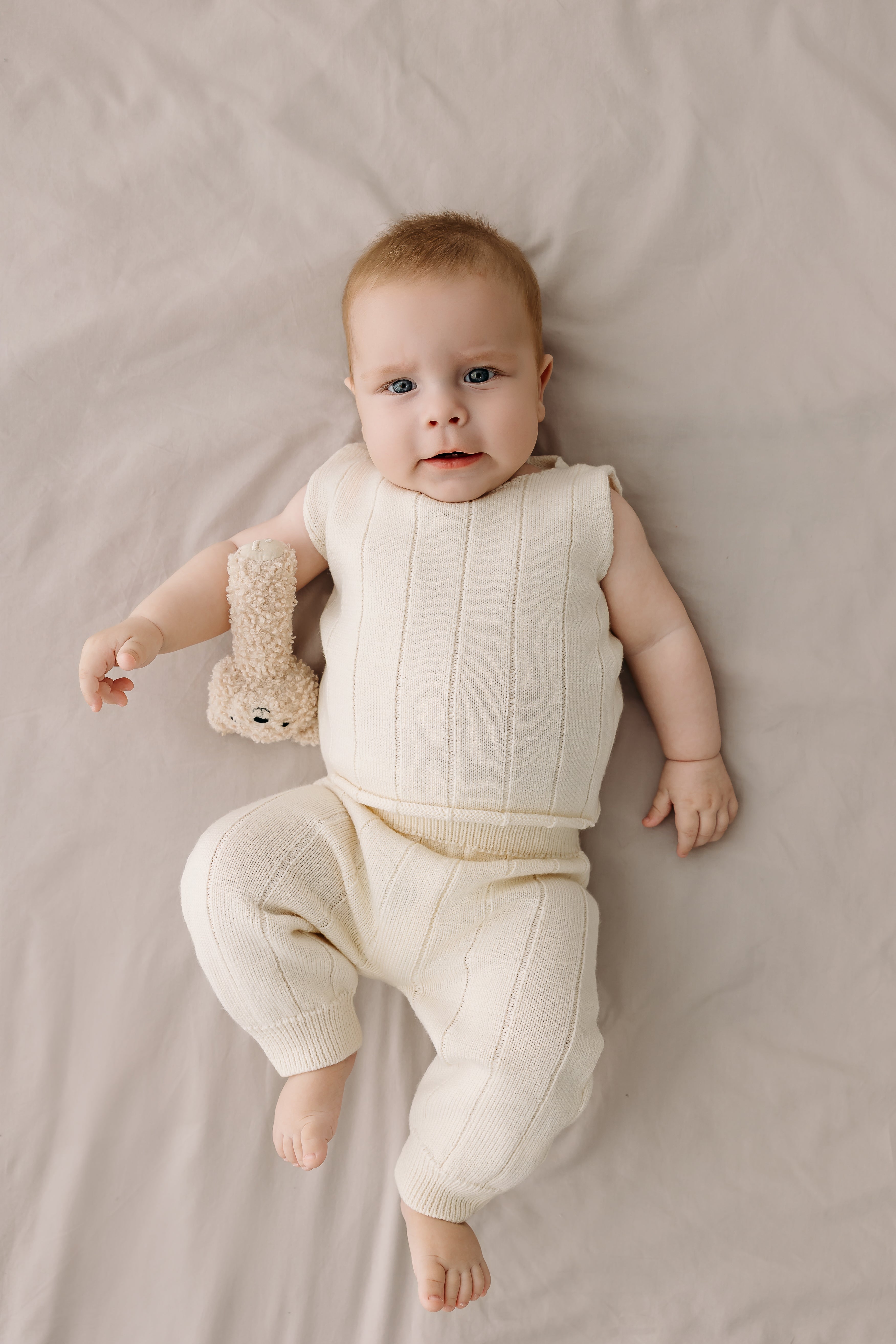 Naj bo vaš malček udoben in eleganten v naših hlačah za dojenčka iz 100% ekstra-fine Merino volne. Te mehke volnene hlače, zasnovane z mislijo na udobje, gibanje in toplino, so popolne za vsak letni čas – poleti zračne in pozimi udobne.