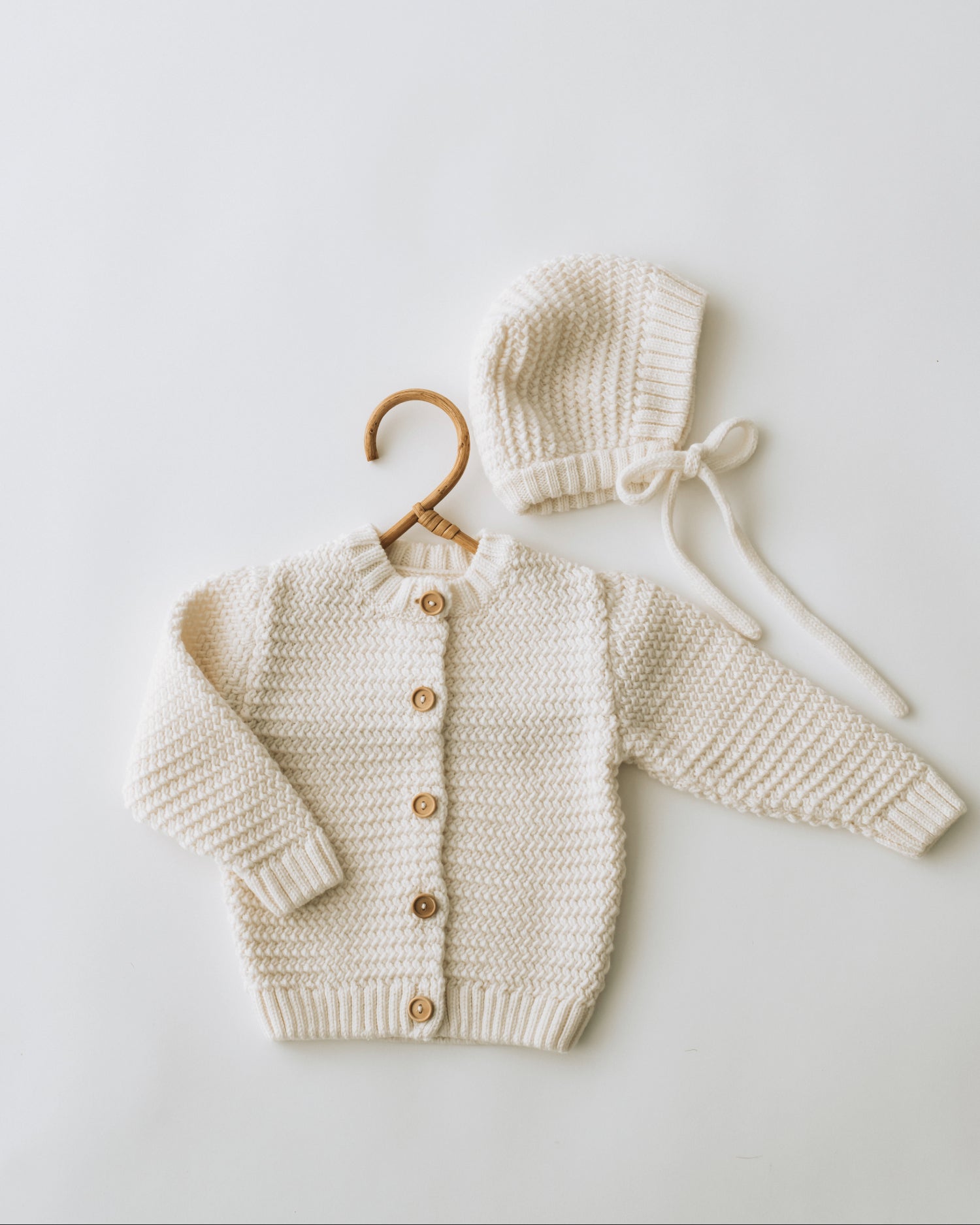 A set of white Merino wool baby cardigan and bonnet with waffle pattern available also in set.